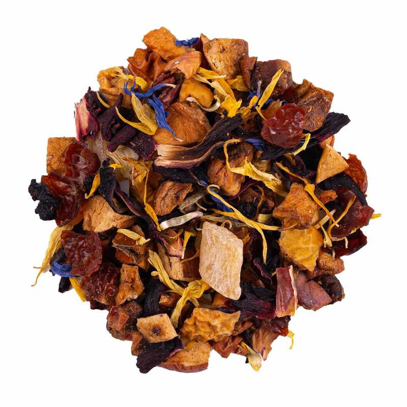 Ingrédients : Pomme, ananas (ananas, sucre) (21%), hibiscus, baie de sureau, cynorrhodon, arôme naturel, pêche (pêche, farine de riz) (3%), fleurs de souci, fleurs de bleuet, fleurs de bleuet, vanille.