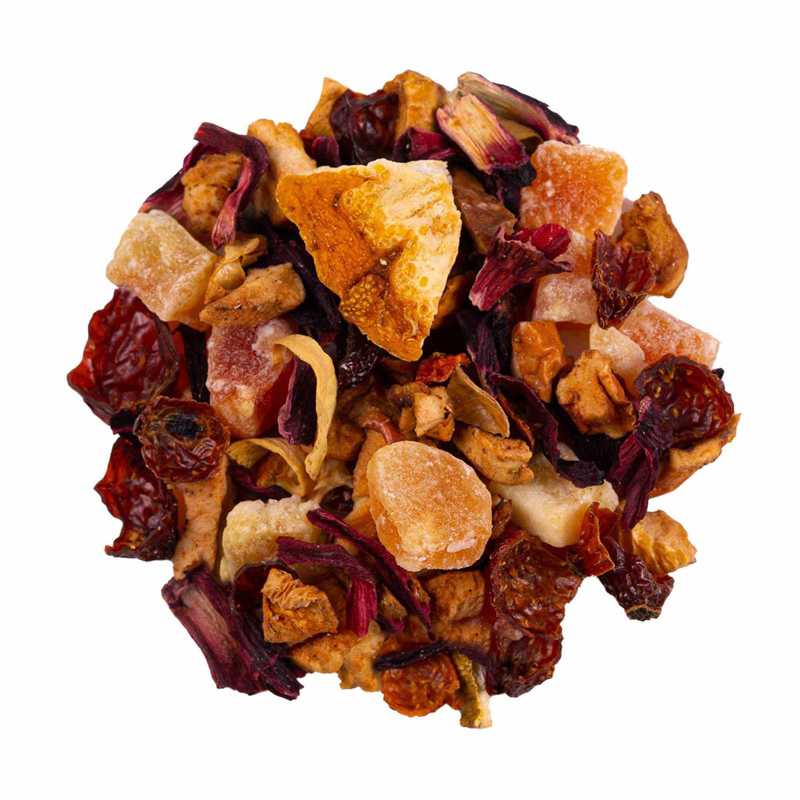 Ingrédients : Pomme, hibiscus, papaye (papaye, sucre), cynorrhodon, écorces d’orange (6%), tranches d’orange (3%), arôme, arôme naturel d’orange, passiflore (2%), fleurs d’oranger (2%).