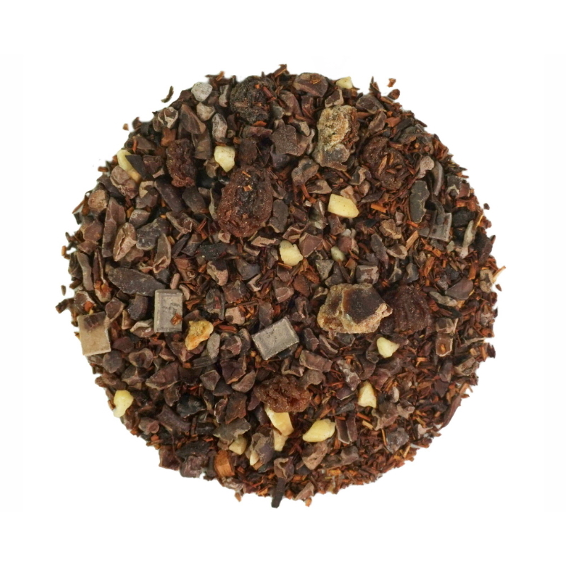 Ingrédients : Fève de cacao concassée, Rooibos Super Grade, raisin (raisin, huile végétale), datte (datte, farine de riz), Honeybush, racine de chicorée, Chocolat (sucre, pâte de cacao, beurre de cacao, émulsifiant : lécithine (E322)) , NOISETTE, arôme.