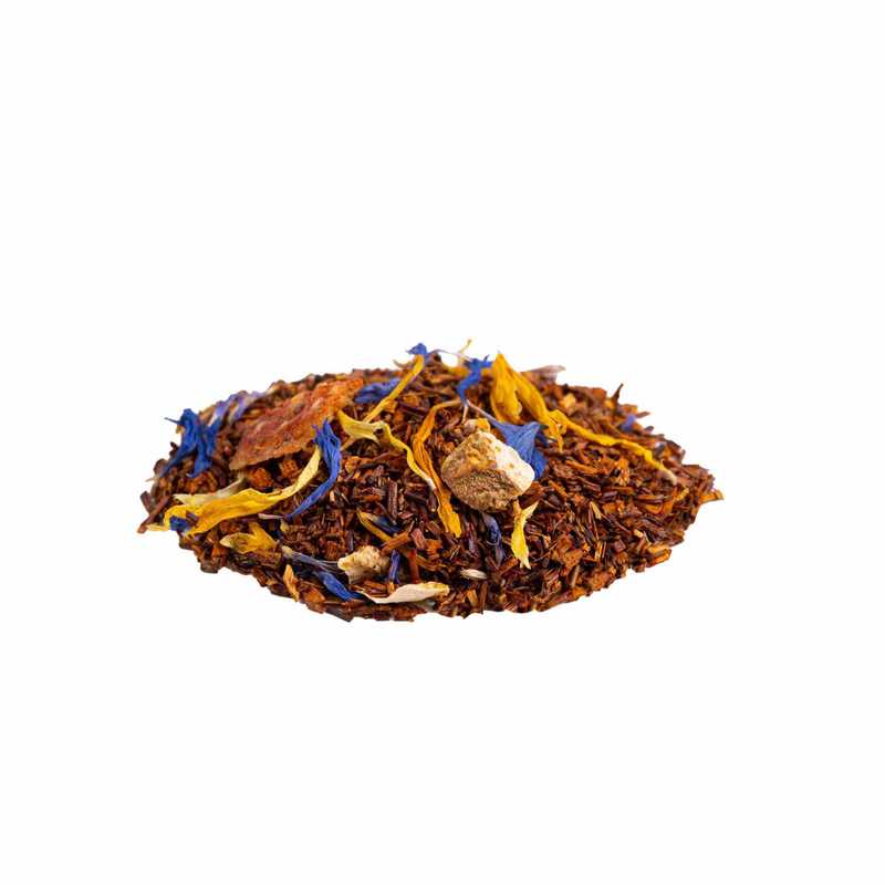 Ingrédients : Rooibos Super Grade, ananas (ananas, sucre), arôme, écorces d’orange, fraise, fleurs de souci, fleurs de bleuet.