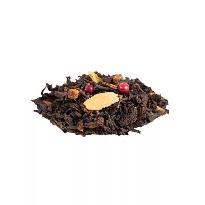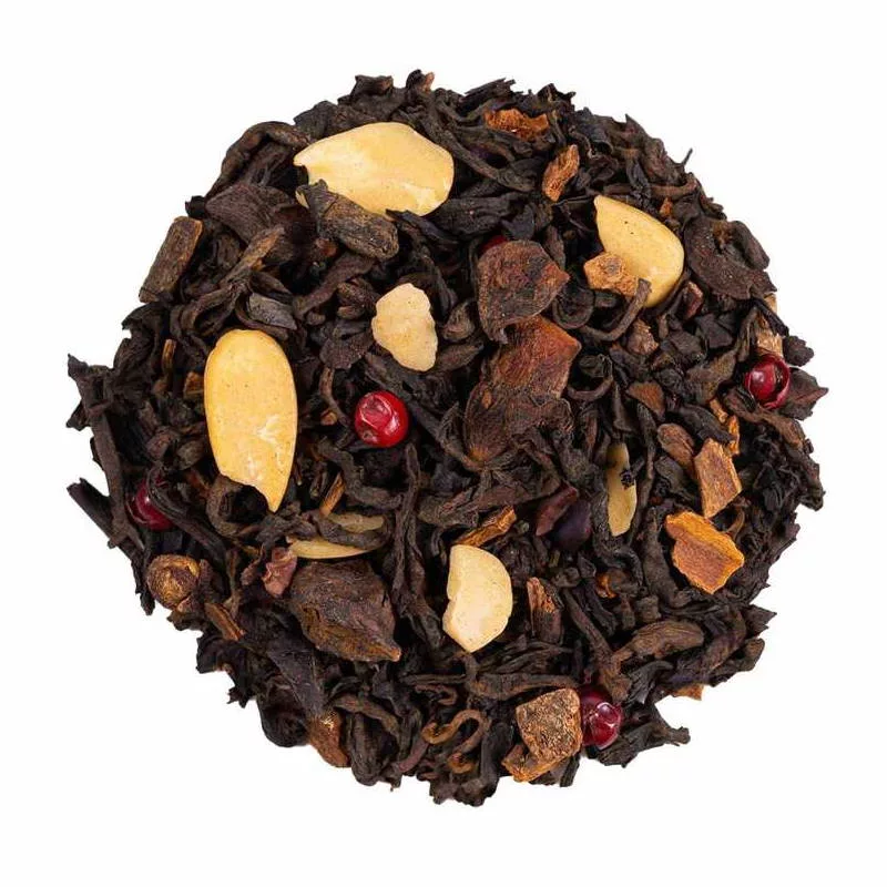Ingrédients : Pu Erh (76%), morceaux de cannelle, fève de cacao concassée, badiane cassée, amande, arôme naturel, clou de girofle, poivre rose.